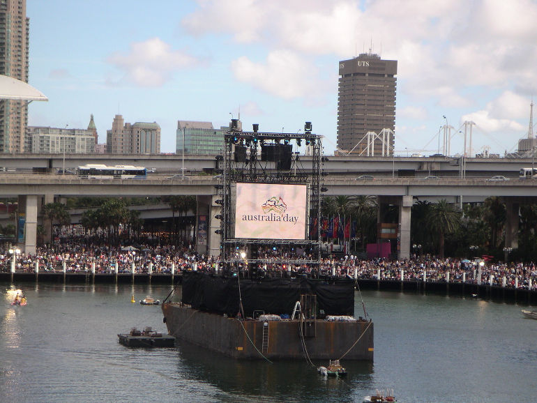 Darling Harbor. Australia Day (January 26th) commemorates Captain Phillip's arival in 1788. A day of heat, crowds, food, music and fireworks. We opted for snags, lambchops and shrimp from the barbie. |