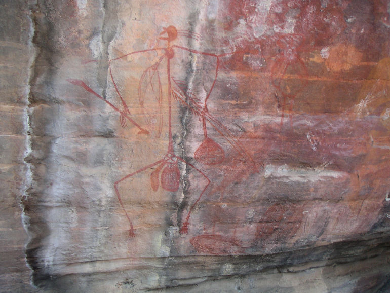 The parable of Mabuyu the hunter is told to children to illustrate the immorality of stealing. Mr. Mabuyu is shown carrying a spear thrower, a dilly bag, barbed spears, and a goose wing fan. Some jerk has swiped the fish from Mr. Mabuyu’s dilly bag and he’s out to get even. |