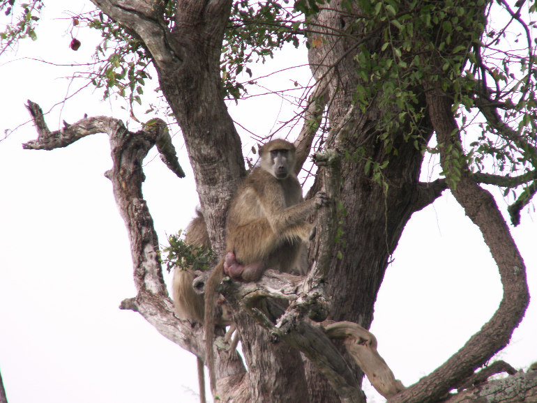 The baboons look down on the macabre sight,