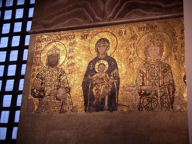 Inside Haghia Sophia, the golden mosaics remind the visitor of the building’s Byzantine origin in the 6th century. Here, the Virgin and Child in the center, flanked by Emperor Johannes Komnenos II and Empress Irene. |