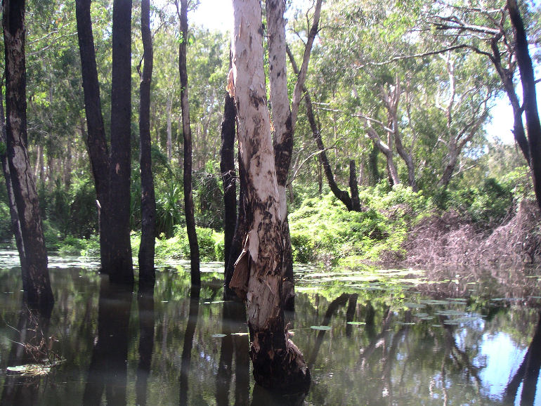 Eucalypt tree trunks, burned in the dry, drowned in the wet.